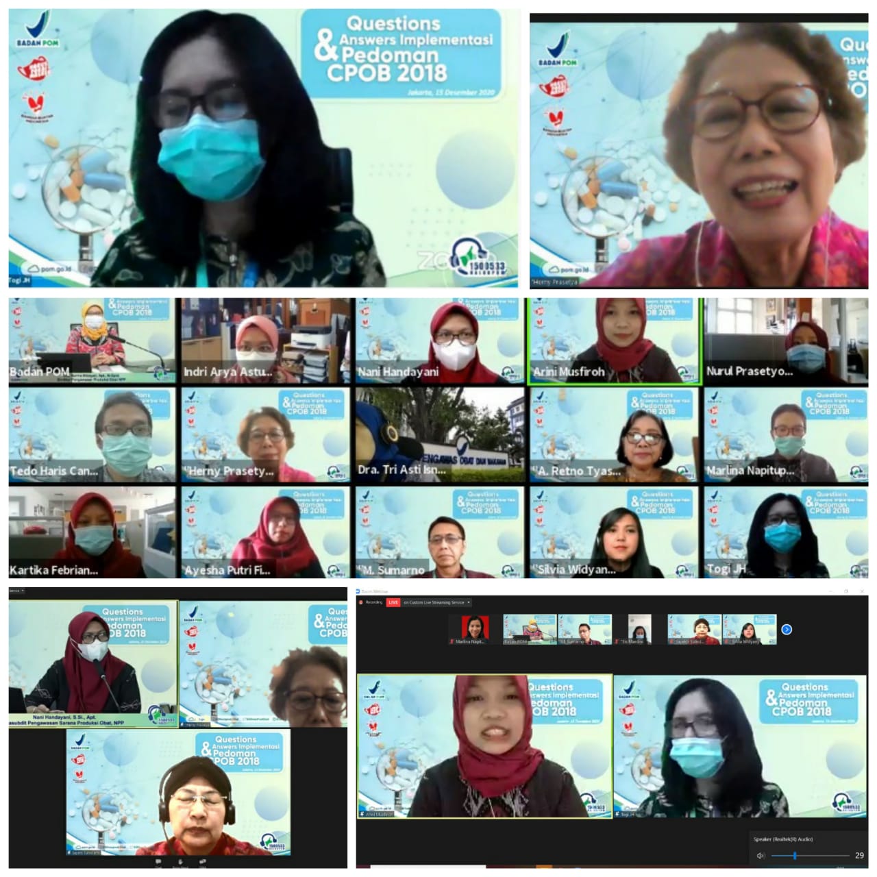 Sosialisasi sekaligus penerbitan Buku Q&A Implementasi Pedoman CPOB 2018 dilakukan pada tanggal 15 Desember 2020 melalui Webinar secara online yang dihadiri oleh perwakilan dari pelaku usaha yang memproduksi obat. Pada kesempatan tersebut, Direktur Pengawasan Produksi Obat, Narkotika, Psikotropika, dan Prekursor menyampaikan overview Q&A Implementasi Pedoman CPOB 2018 mencakup latar belakang, tujuan serta mekanisme penyusunan buku yang telah dilakukan. Selain itu Tim Ahli CPOB menyampaikan beberapa materi khusus yang perlu diangkat karena terdapat perubahan ketentuan yang signifikan serta perbedaan persepsi yang sering terjadi. Materi yang disampaikan tersebut antara lain terkait Bahan Aktif, Validasi Proses, Pencegahan Kontaminasi dan Kontaminasi Silang, Validasi Pembersihan, Verifikasi Transportasi.
